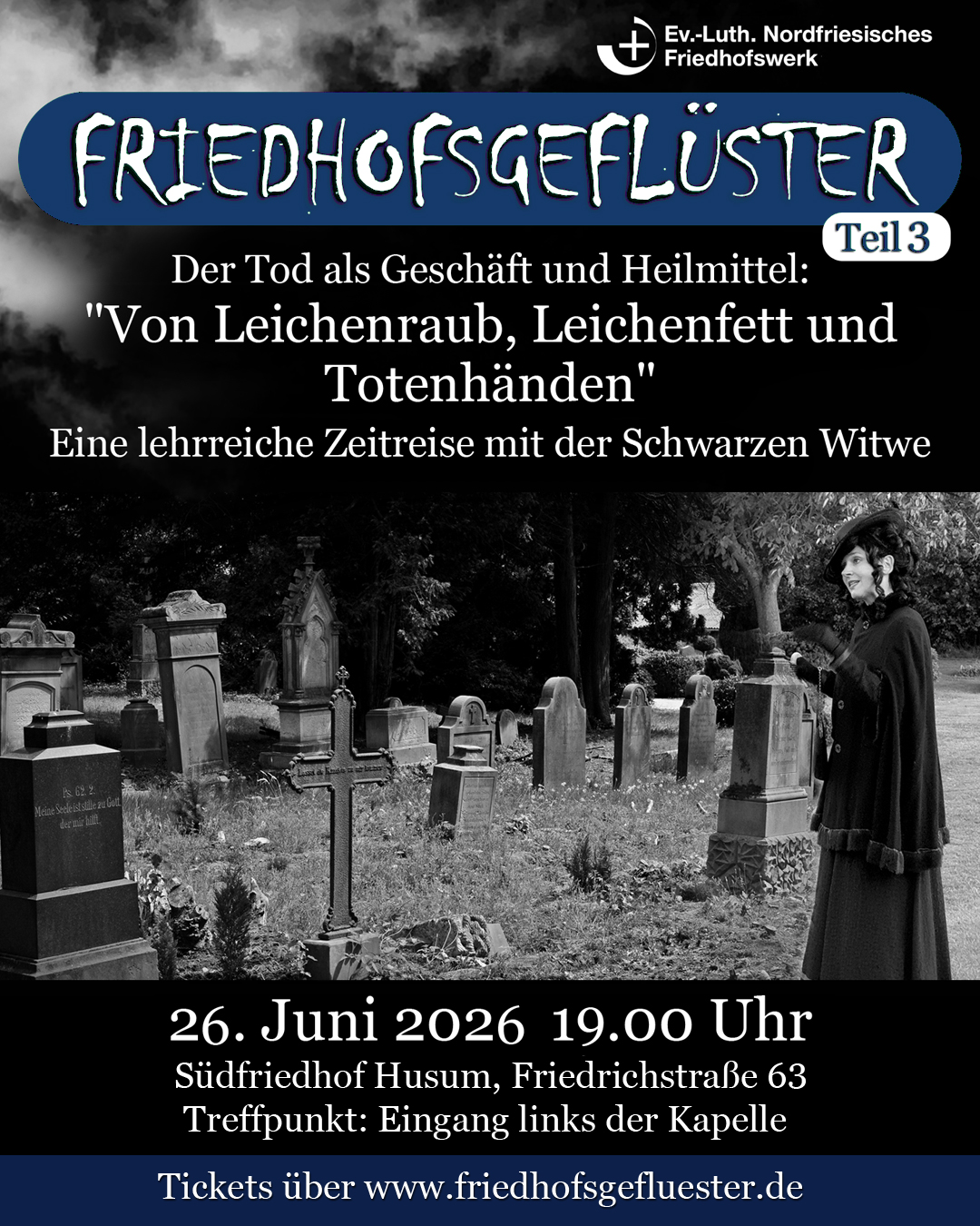 Sichern Sie sich jetzt Ihre Tickets für den Rundgang am 26. Juni auf dem Südfriedhof in Husum, wenn es wieder in eine düstere, lehrreiche Zeitreise geht.