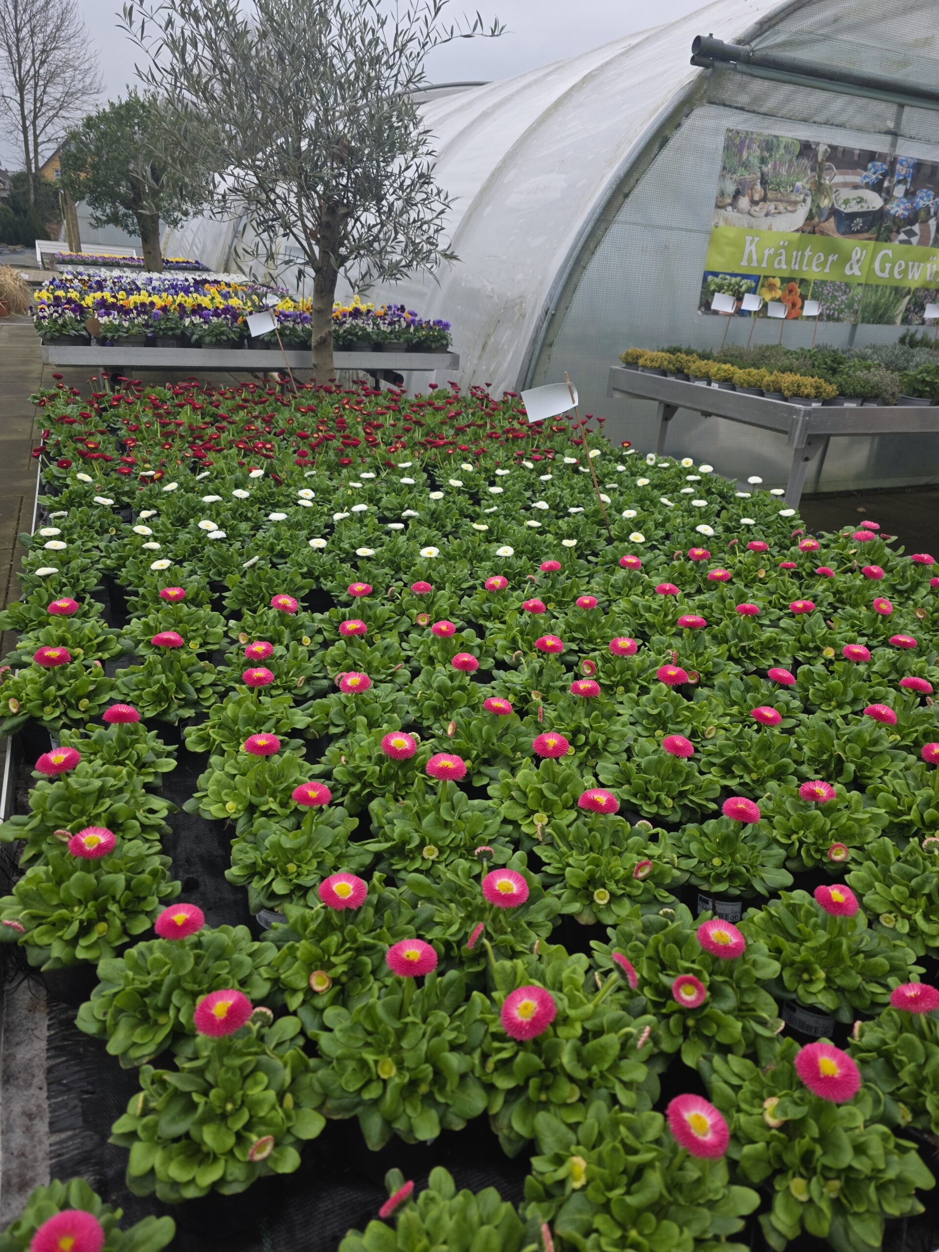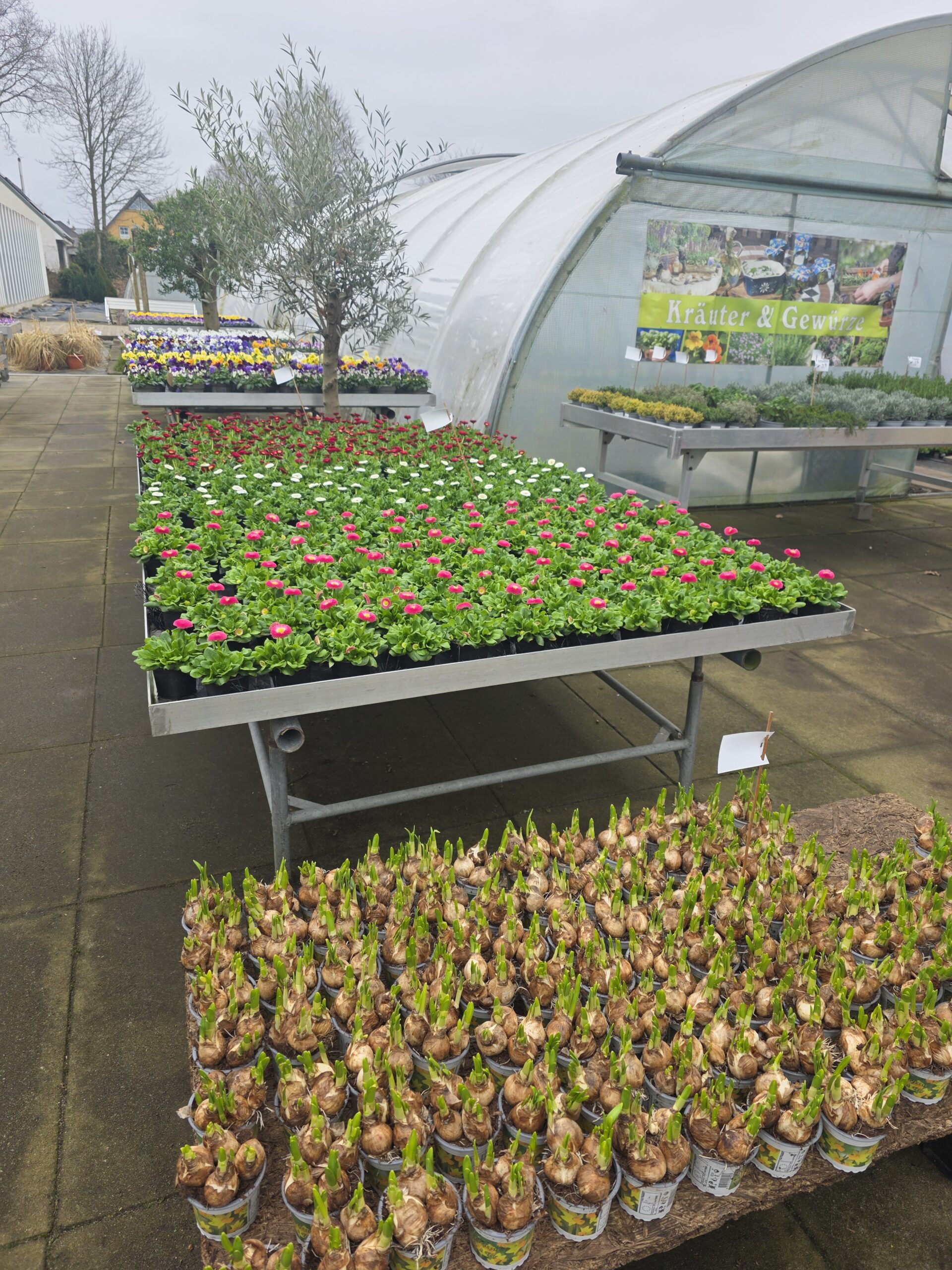Es wartet eine bunte Auswahl an Hornveilchen, Primeln, Ampeln, Zwiebeln, Bellis und Pflanzschalen auf Sie. Für ein paar Pflanzen, die wir sonst bereits Anfang März anbieten, war der Winter leider zu lange zu kalt. Diese kommen daher mit ein wenig Verzögerung in den kommenden Wochen ins Sortiment.